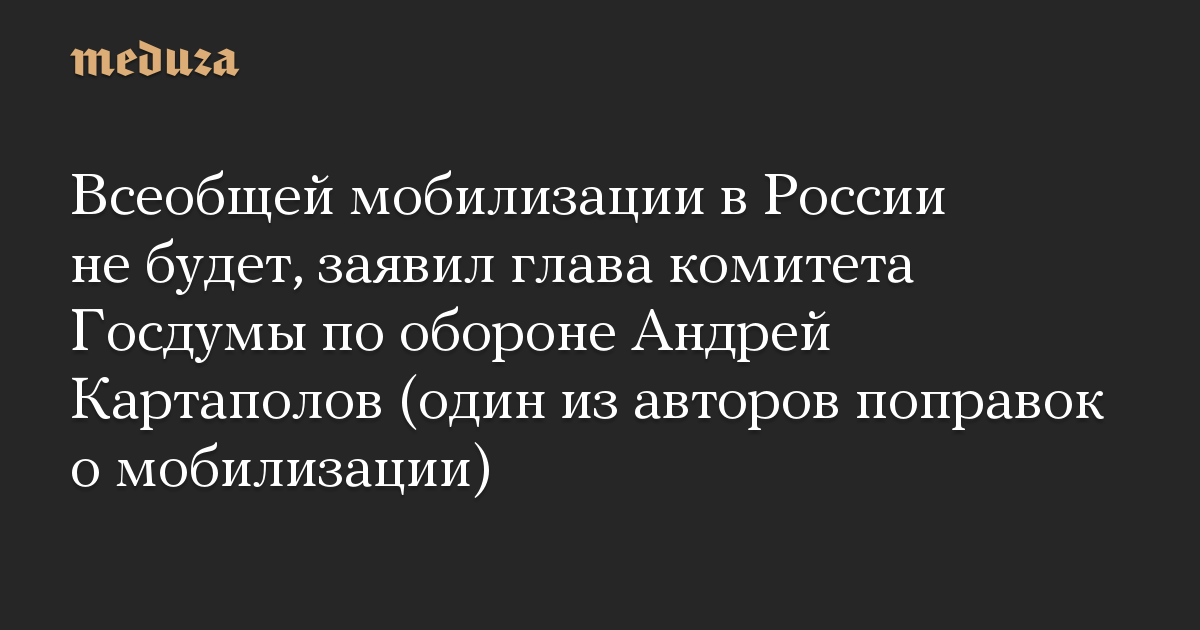 Всеобщей мобилизации в России не будет, заявил глава комитета Госдумы по обороне Андрей Картаполов (один из авторов поправок о мобилизации)