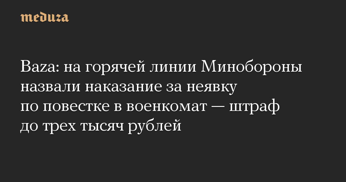 Сотрудники горячей линии Минобороны РФ заявили Baza, что за неявку в военкомат по повестке предусмотрена лишь административная ответственность — по статье «Неисполнение гражданами обязанностей по воинскому учету» (21.5 КоАП).