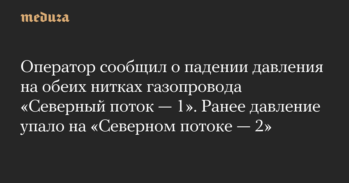 Оператор сообщил о падении давления на обеих нитках газопровода «Северный поток — 1». Ранее давление упало на «Северном потоке — 2»