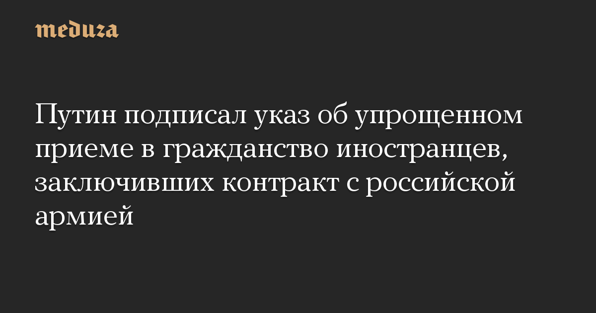 Президент России Владимир Путин подписал указ об упрощенном предоставлении гражданства иностранцам, которые заключили контракт о прохождении военной службы в вооруженных силах РФ. Соответствующий документ опубликован на официальном интернет-портале правовых актов.