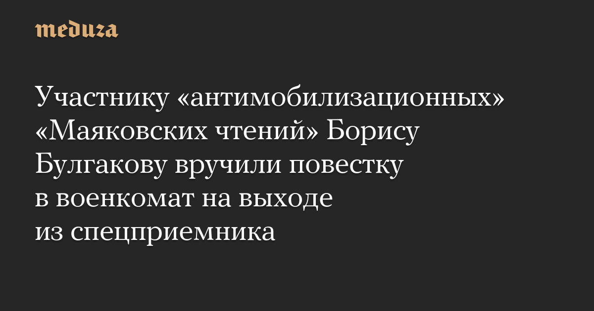 Поэту Борису Булгакову, принимавшему участие в «Маяковских чтениях», вручили повестку после освобождения из спецприемника. Об этом сам Булгаков рассказал «Медиазоне».
