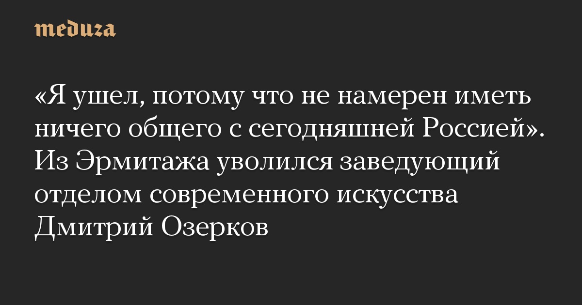 Дмитрий Озерков, занимавший пост заведующего отделом современного искусства Эрмитажа, объявил об увольнении. В инстаграме Озерков написал, что принял решение уйти из Эрмитажа, где проработал 22 года, после начала вторжения России в Украину.