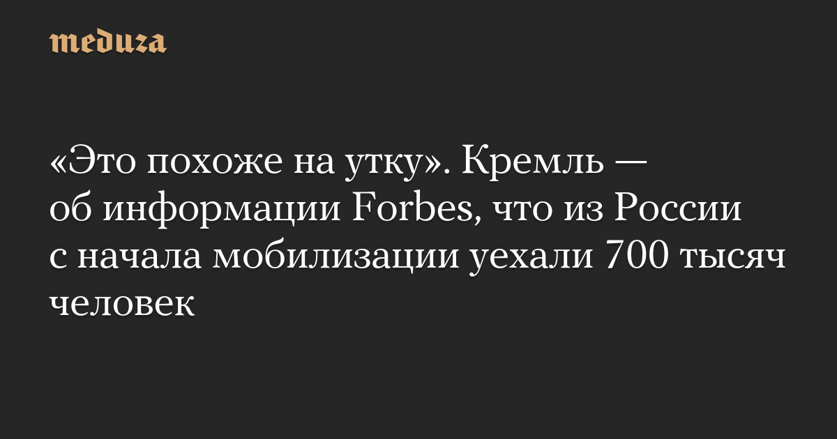 Пресс-секретарь президента РФ Дмитрий Песков призвал не воспринимать серьезно публикацию российской версии журнала Forbes, сообщившего, что с начала мобилизации из России, по данным источников, уехали 600-700 тысяч человек. Высказывание Пескова приводит радио «Маяк».