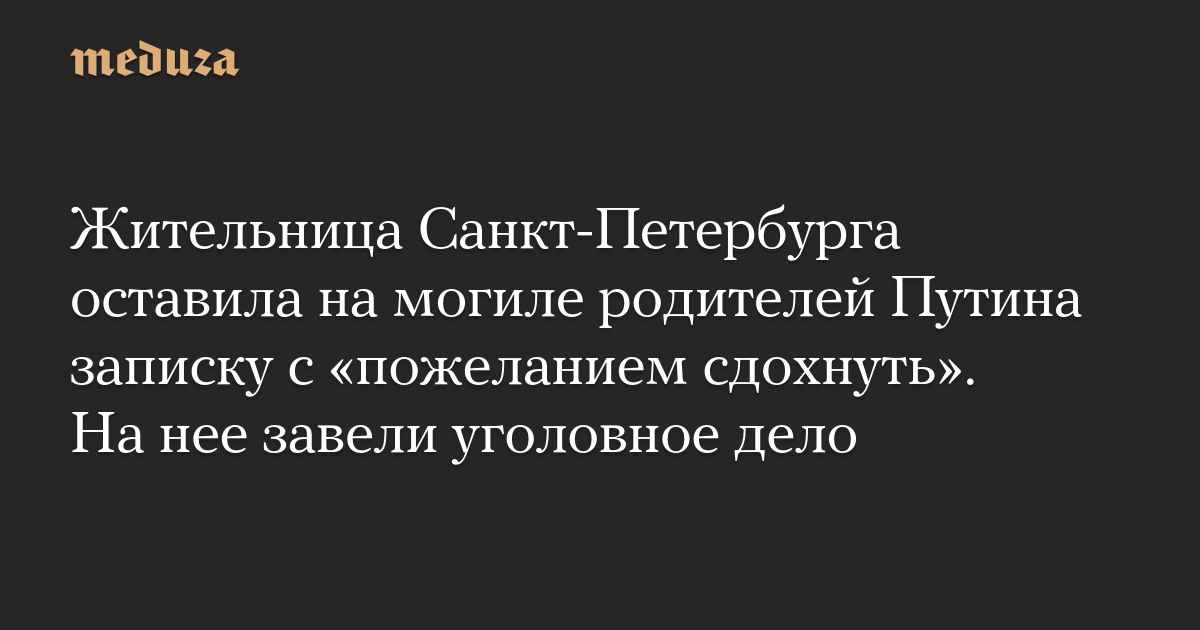 На жительницу Санкт-Петербурга Ирину Цыбаневу завели уголовное дело из-за записки, оставленной на могиле родителей президента РФ Владимира Путина, рассказал «Медиазоне» ее сын Максим Цыбанев.