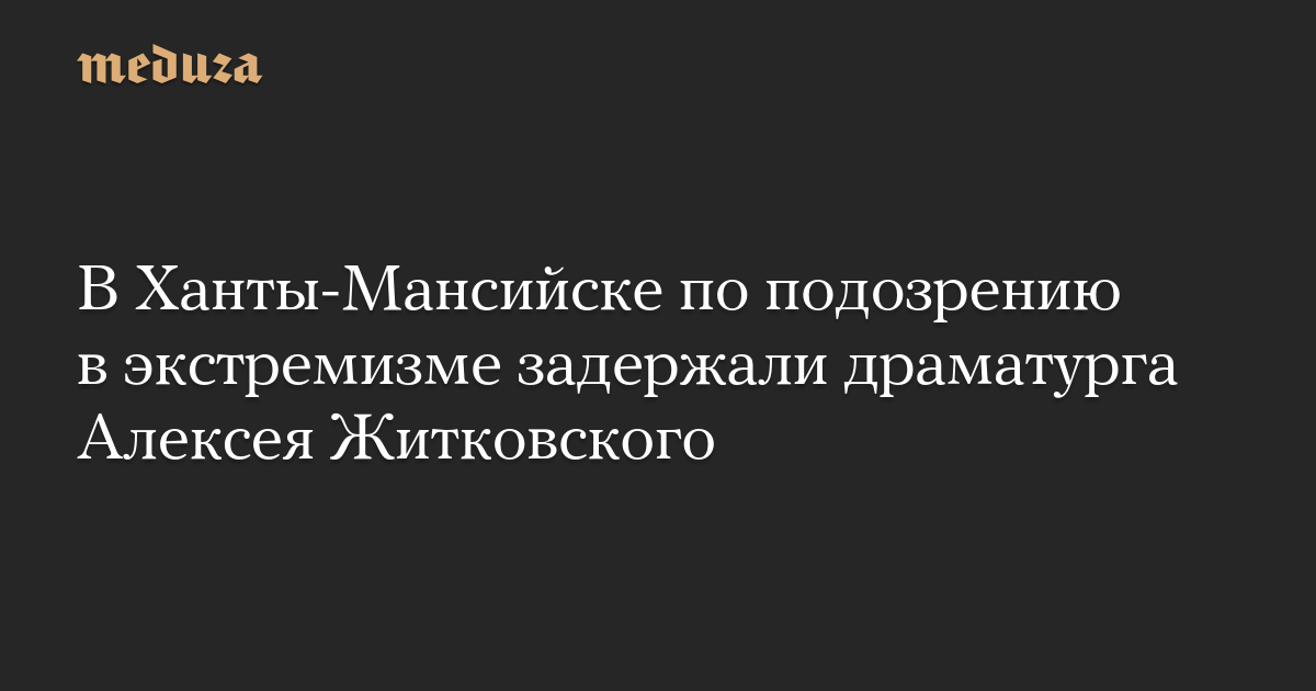 В Ханты-Мансийске 19 октября задержали драматурга Алексея Житковского. Он рассказал, что его подозревают в экстремизме, а в его квартире в Нижневартовске прошел обыск. Об этом сообщает «Медиазона» со ссылкой на закрытый аккаунт Житковского во «ВКонтакте».