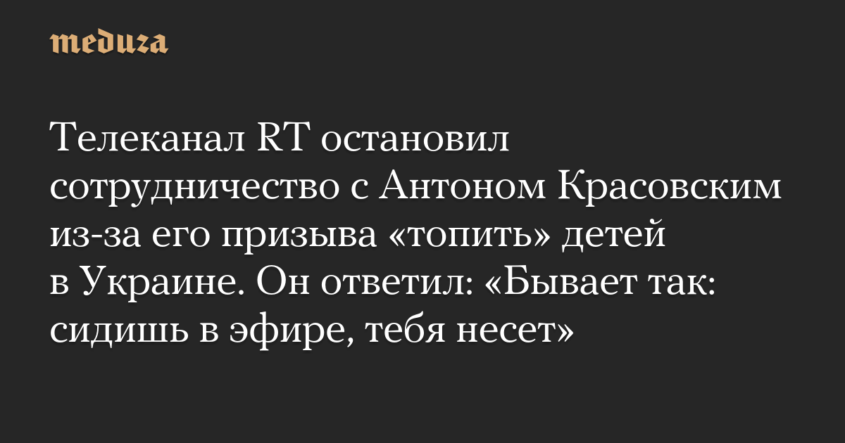 Телеканал RT остановил сотрудничество с Антоном Красовским из-за его призыва «топить» детей в Украине. Он ответил: «Бывает так: сидишь в эфире, тебя несет»