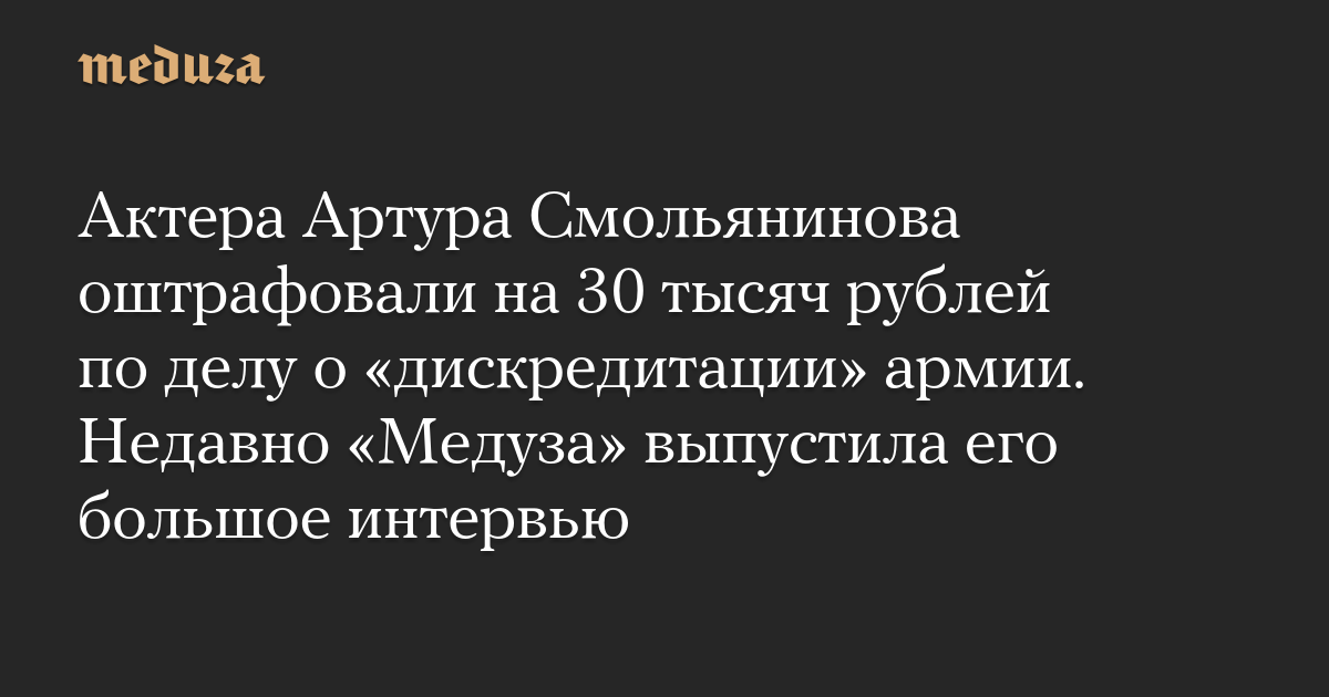 Актера Артура Смольянинова оштрафовали на 30 тысяч рублей по делу о «дискредитации» армии. Недавно «Медуза» выпустила его большое интервью