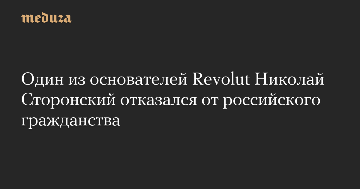 Бизнесмен Николай Сторонский, основавший вместе с Владом Яценко банковский сервис Revolut, отказался от российского гражданства. Об этом пишет британское издание The Telegraph со ссылкой на представителей Revolut. Отказ Сторонского от российского гражданства подтвердили в Revolut журналистам Forbes.