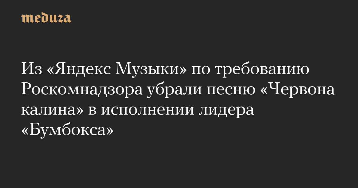 Обновление. В пресс-службе «Яндекс Музыки» сообщили «Медузе», что доступ к песне «Червона калина» в исполнении лидера украинской группы «Бумбокс» Андрея Хлывнюка тоже ограничили по требованию Роскомнадзора.