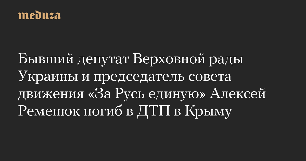 Бывший депутат Верховной рады Украины и председатель cовета движения «За Русь единую» Алексей Ременюк погиб в ДТП в Крыму. Об этом РБК рассказал глава организации Михаил Житков.
