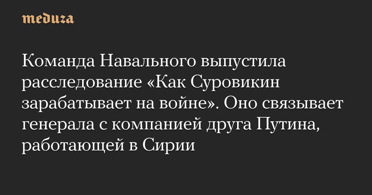 Команда Навального выпустила расследование «Как Суровикин зарабатывает на войне». Оно связывает генерала с компанией друга Путина, работающей в Сирии