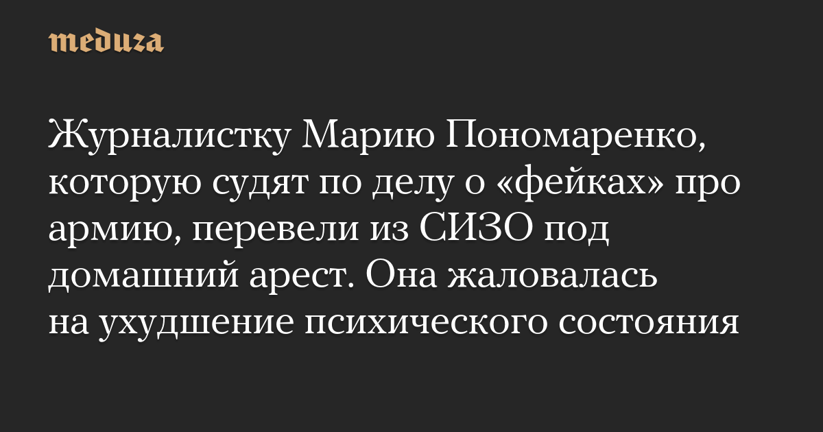 Журналистку Марию Пономаренко, которую судят по делу о «фейках» про армию, перевели из СИЗО под домашний арест. Она жаловалась на ухудшение психического состояния