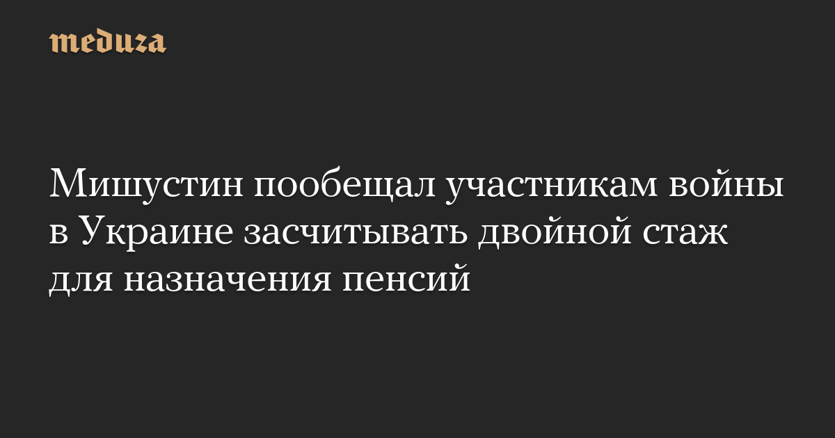 «Стаж для назначения страховой пенсии станет засчитываться в двойном размере. Такой же расчет будет применяться при назначении досрочной пенсии, например, для тех, кто до мобилизации работал на Крайнем Севере или на вредных производствах», — цитирует агентство слова премьер-министра.