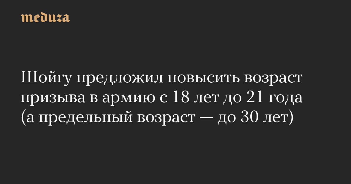 «При комплектовании Вооруженных сил [необходимо] поэтапно увеличить возраст призыва граждан с 18 до 21 года, а предельный — повысить до 30 лет», — заявил глава Минобороны на коллегии ведомства 21 декабря. Сейчас предельный возраст призыва в России ограничен 27 годами.