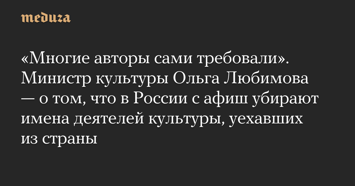 «Начнем с того, что многие авторы сами требовали убрать себя с афиш. Все забывают этот момент. Да, действительно, была такая ситуация с требованием самих зрителей. Я полагаю, что тот репертуар, который создавался в течение 15 лет, не должен быть разрушен оттого, что режиссер, получивший гонорар десять лет назад, покинул эту страну две недели назад и в своих соцсетях что-то там написал», — сказала министр в интервью ТАСС.