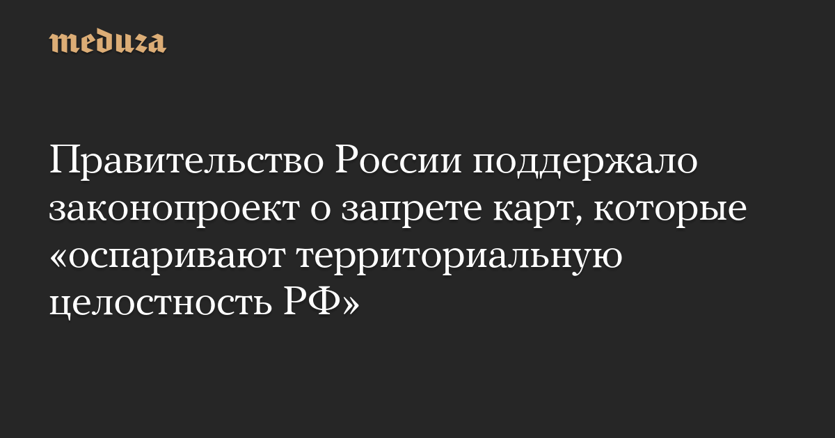 Правительство России дало положительный отзыв на законопроект, приравнивающий карты, «оспаривающие территориальную целостность РФ», к экстремистским материалам. Об этом сообщает ТАСС со ссылкой на документ, который есть в распоряжении агентства.