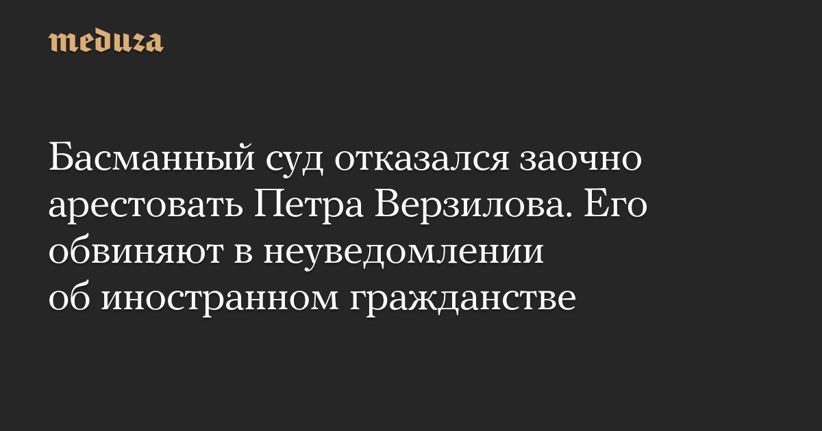 Басманный суд Москвы отказался заочно арестовать издателя «Медиазоны» и участника Pussy Riot Петра Верзилова по делу о неуведомлении о наличии второго гражданства.