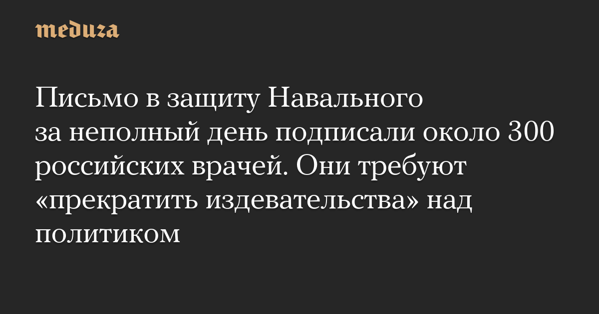 10 января за неполный день после публикации открытого письма к президенту России Владимиру Путину в поддержку оппозиционного политика Алексея Навального это письмо подписали около 300 российских врачей.