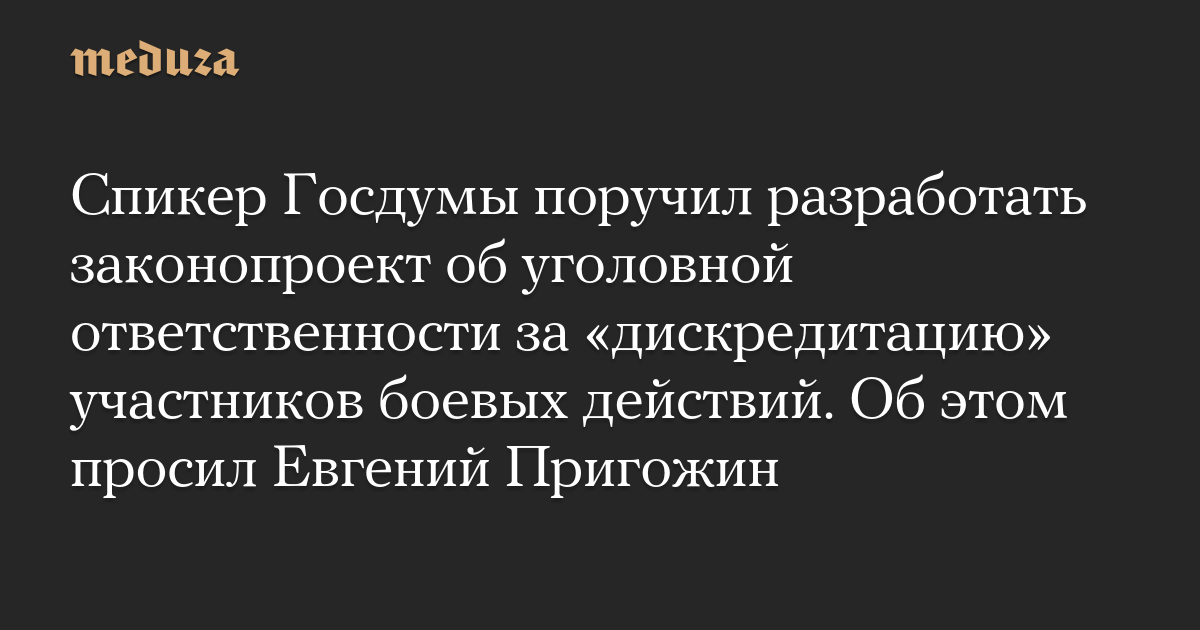 Спикер Госдумы поручил разработать законопроект об уголовной ответственности за «дискредитацию» участников боевых действий. Об этом просил Евгений Пригожин