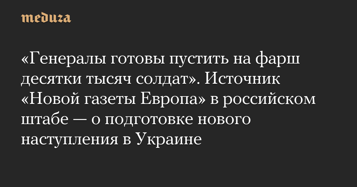 По словам источника «Новой газеты Европа», российские генералы готовы «пустить на фарш» десятки тысяч военнослужащих в угоду прихоти высшего командования. При этом они не принимают в расчет никакие очевидные опасности нового маневра, утверждает он.