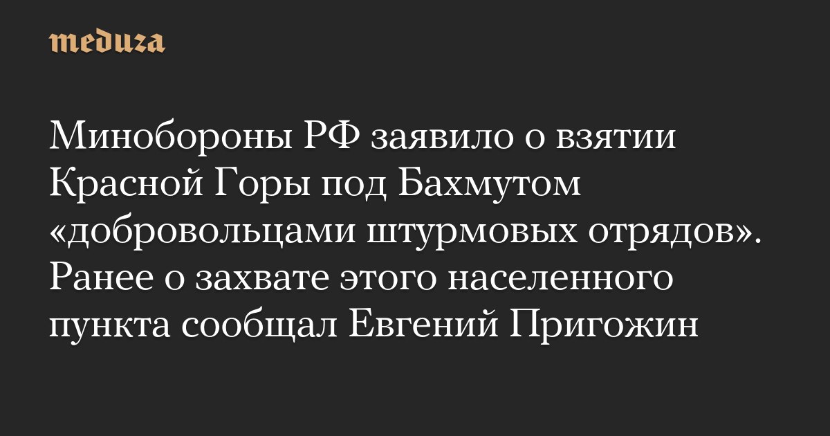 Минобороны РФ заявило о взятии Красной Горы под Бахмутом «добровольцами штурмовых отрядов». Ранее о захвате этого населенного пункта сообщал Евгений Пригожин