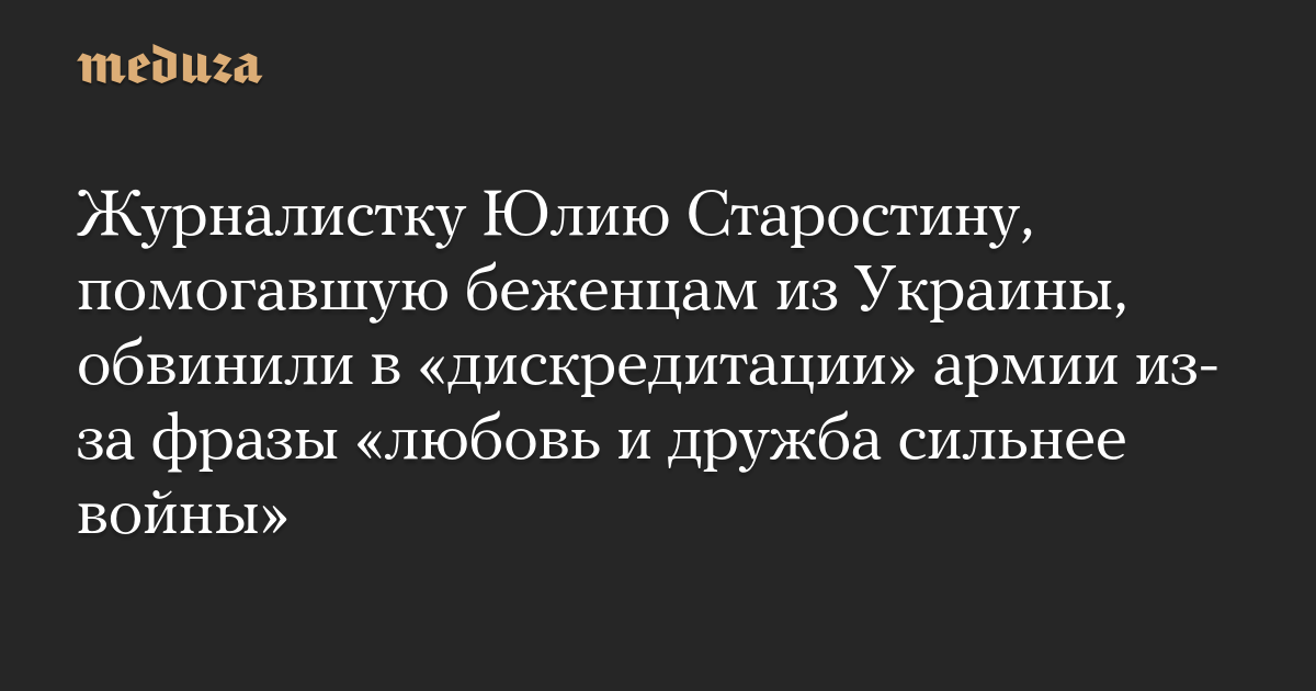 Журналистку Юлию Старостину, помогавшую беженцам из Украины, обвинили в «дискредитации» армии из-за фразы «любовь и дружба сильнее войны»