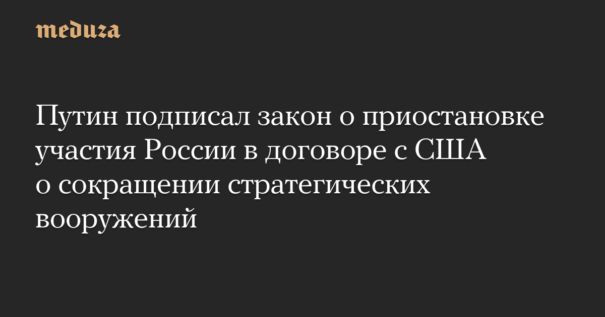 Президент России Владимир Путин подписал закон о приостановке участия РФ в Договоре о сокращении стратегических наступательных вооружений (ДСНВ). Соответствующий документ опубликован на сайте правовой информации.