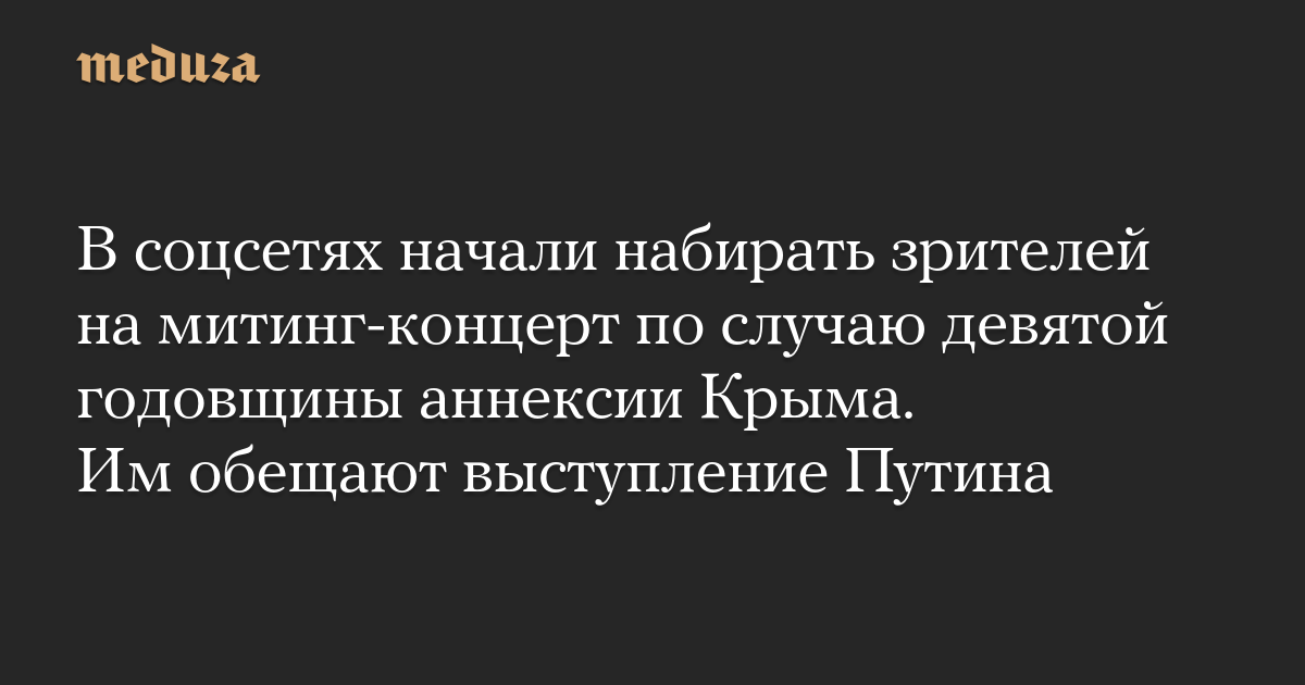 В соцсетях начали набирать зрителей на митинг-концерт по случаю девятой годовщины аннексии Крыма. Им обещают выступление Путина