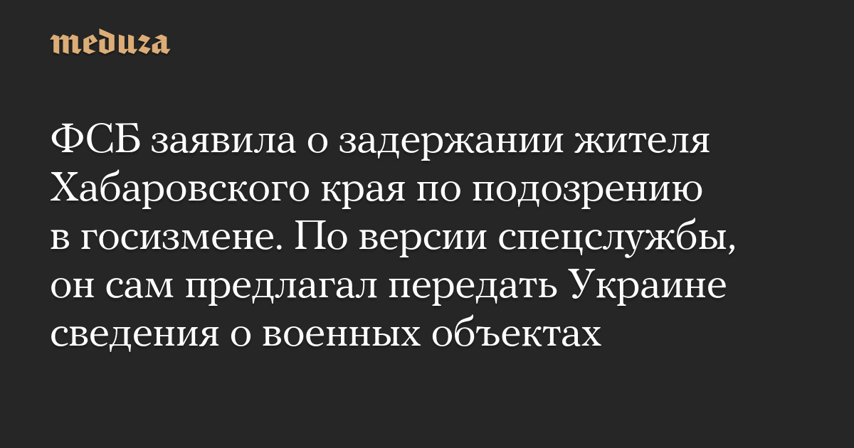ФСБ заявила о задержании жителя Хабаровского края по подозрению в госизмене. По версии спецслужбы, он сам предлагал передать Украине сведения о военных объектах