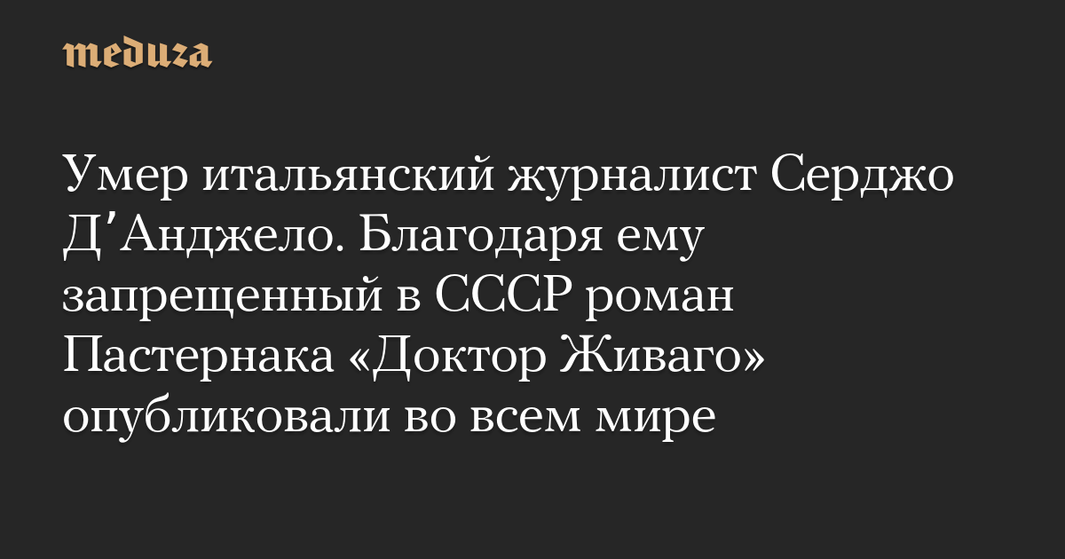 Умер итальянский журналист Серджо ДʼАнджело. Благодаря ему запрещенный в СССР роман Пастернака «Доктор Живаго» опубликовали во всем мире