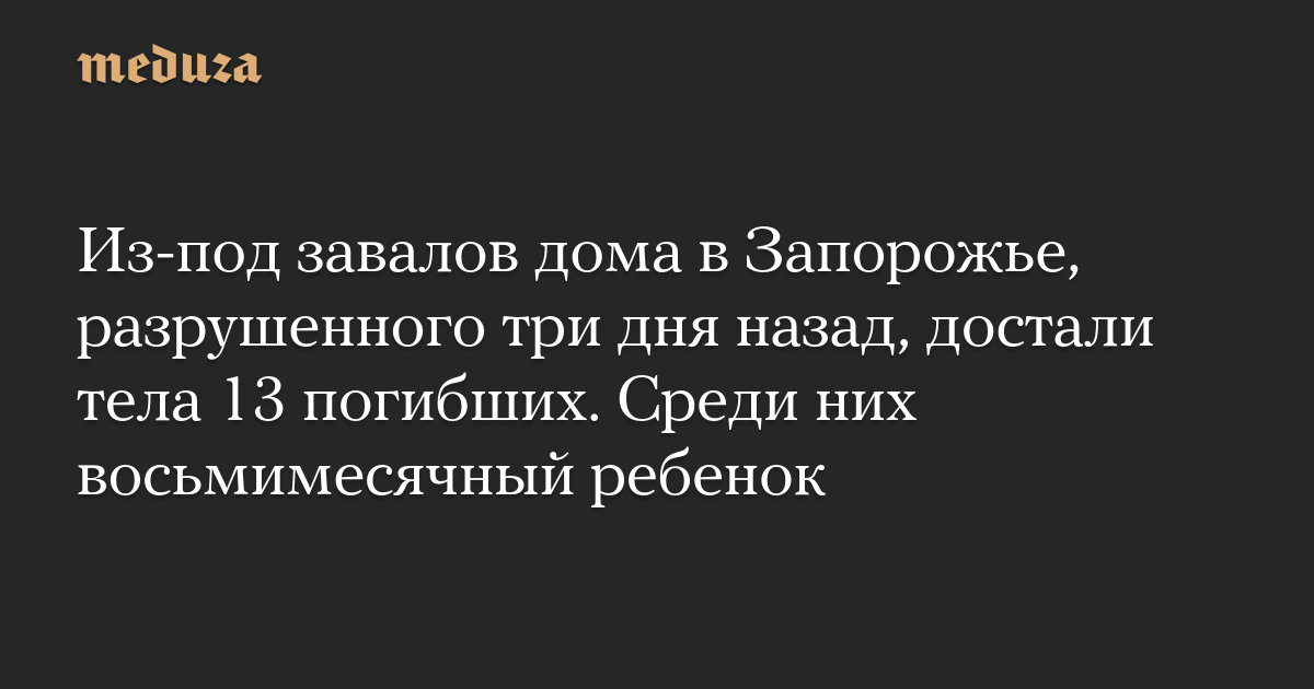 Из-под завалов дома в Запорожье, разрушенного три дня назад, достали тела 13 погибших. Среди них восьмимесячный ребенок