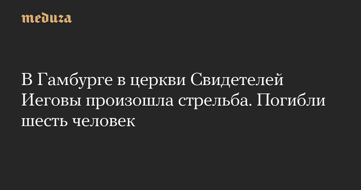 В церкви Свидетелей Иеговы в Гамбурге произошла стрельба, в результате которой погибли не менее шести человек, еще 24 человека получили ранения, сообщают местные издания. Газета BILD пишет о семи погибших. Входит ли в их число стрелявший, неизвестно.