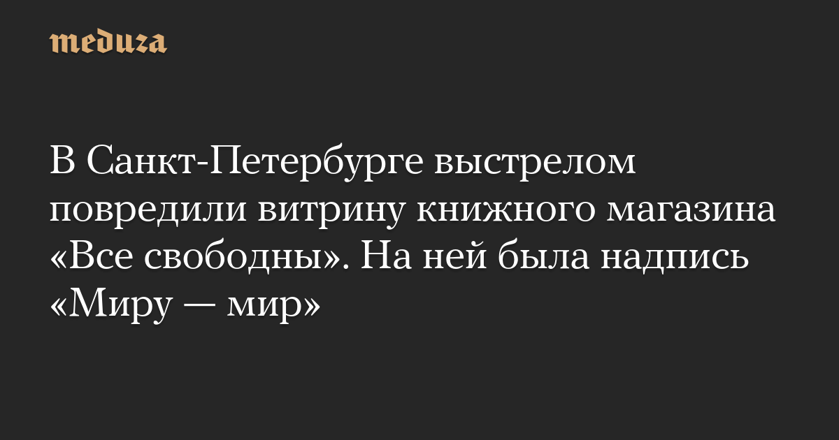 В ночь на 11 марта витрину независимого книжного магазина «Все свободны» в Санкт-Петербурге разбили выстрелом. На фотографиях, которые опубликованы в фейсбуке художника Артем Лоскутов, а также в телеграм-канале магазина, видно, что стреляли в стекло, на котором была надпись «Миру — мир».