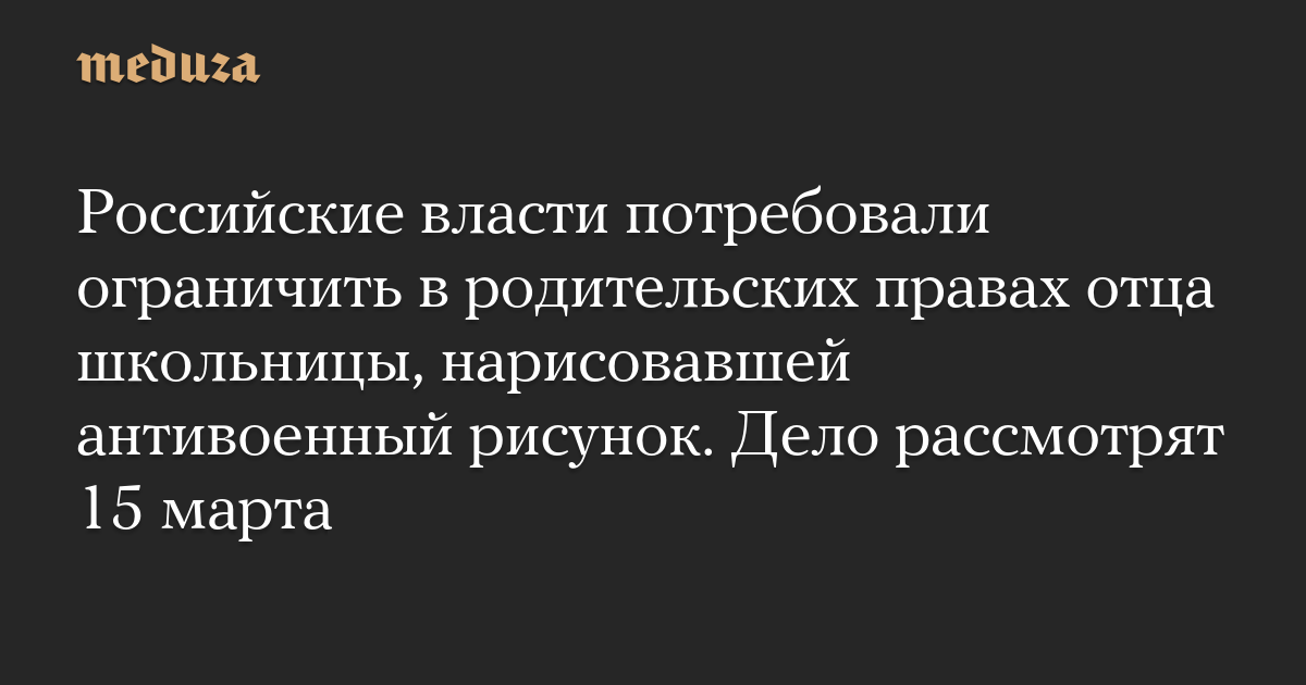 Российские власти потребовали ограничить в родительских правах отца школьницы, нарисовавшей антивоенный рисунок. Дело рассмотрят 15 марта