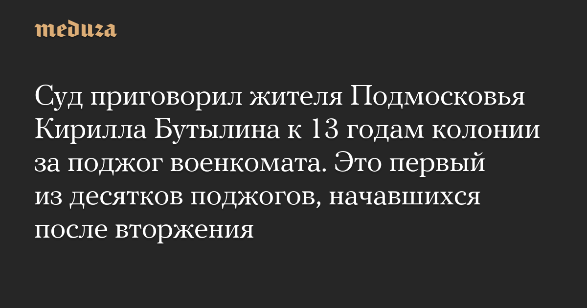 Суд приговорил жителя Подмосковья Кирилла Бутылина к 13 годам колонии за поджог военкомата. Это первый из десятков поджогов, начавшихся после вторжения