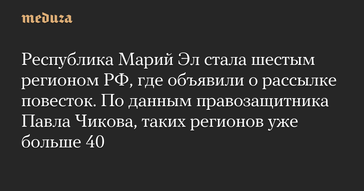 Республика Марий Эл стала шестым регионом РФ, где объявили о рассылке повесток. По данным правозащитника Павла Чикова, таких регионов уже больше 40