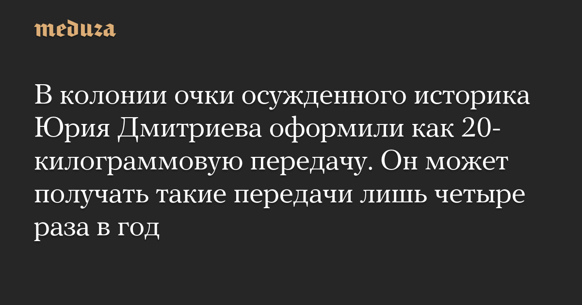 В колонии очки осужденного историка Юрия Дмитриева оформили как 20-килограммовую передачу. Он может получать такие передачи лишь четыре раза в год