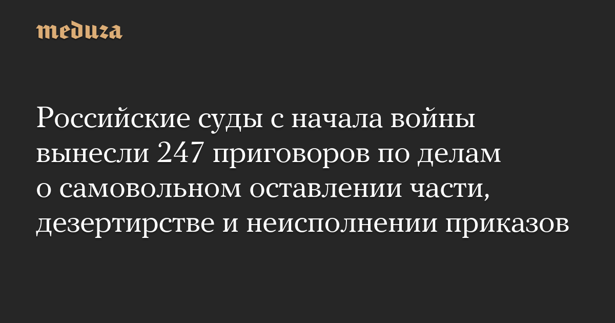 Гарнизонные военные суды в России с начала полномасштабного вторжения войск РФ в Украину вынесли приговоры по 247 делам о самовольном оставлении части, дезертирстве и неисполнении приказов. Об этом пишет «Медиазона», изучившая судебную статистику.