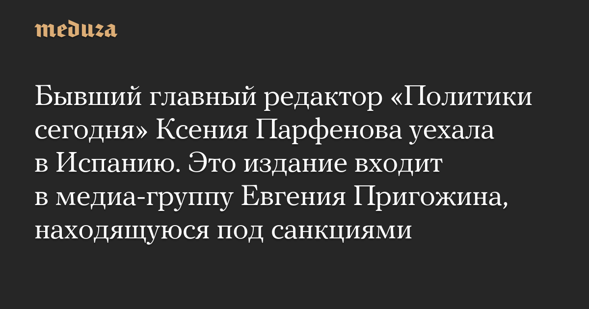 Бывший главный редактор «Политики сегодня» Ксения Парфенова уехала в Испанию. Это издание входит в медиа-группу Евгения Пригожина, находящуюся под санкциями