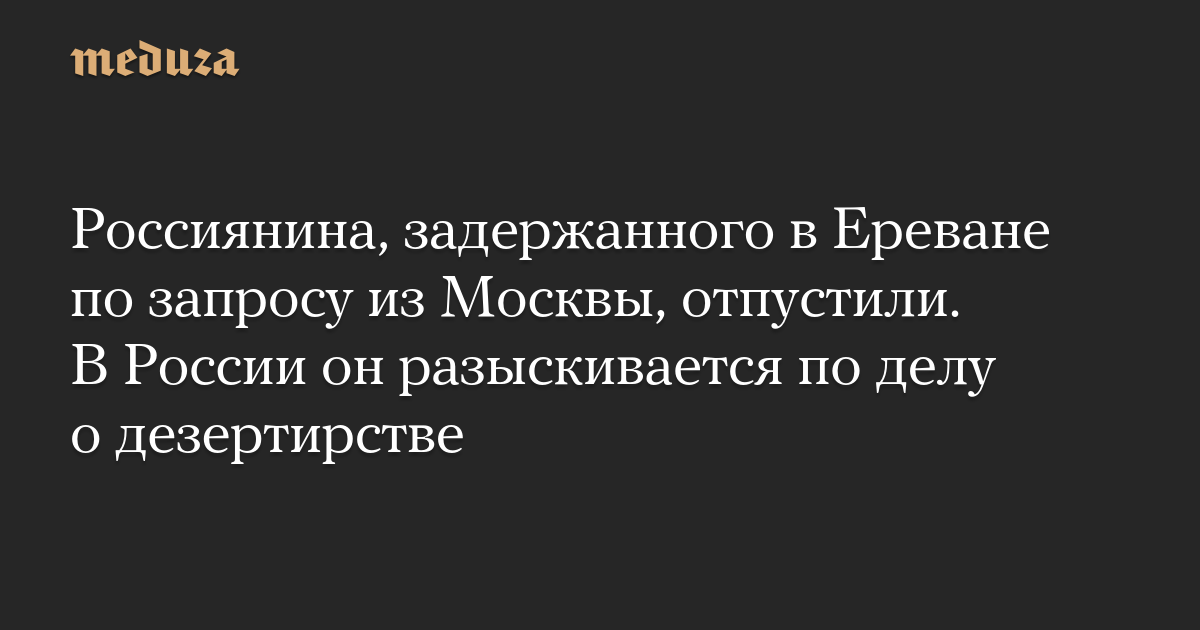 Задержанного в Ереване россиянина, которого в России разыскивают по подозрению в дезертирстве, отпустили из отдела полиции. Об этом сообщила Генпрокуратура Армении в ответ на запрос издания «Armenia Today».