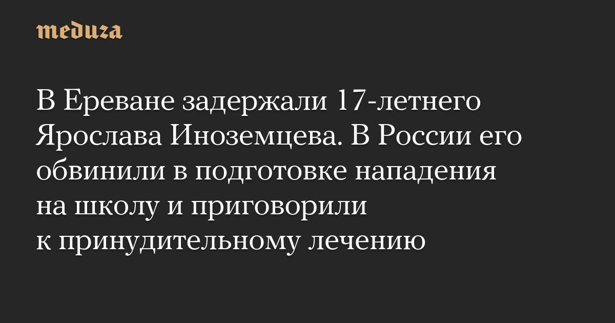 В Ереване по требованию российских властей задержали 17-летнего Ярослава Иноземцева, которого в России признали виновным в подготовке нападения на школу. О задержании подростка телеграм-каналу Sota сообщила его мать, Юлия Иноземцева. Эту информацию она также подтвердила изданию «Кавказ.Реалии».