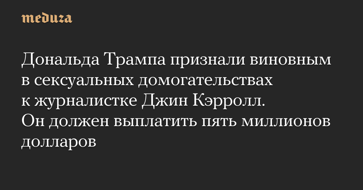 Дональда Трампа признали виновным в сексуальных домогательствах к журналистке Джин Кэрролл. Он должен выплатить пять миллионов долларов