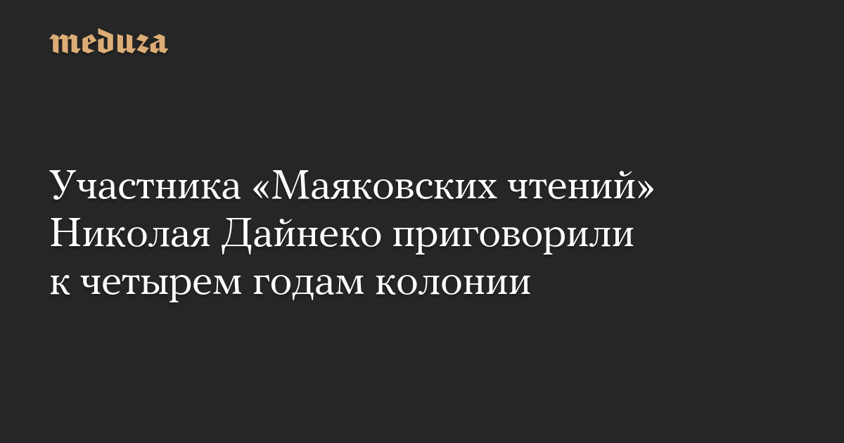 Тверской районный суд Москвы приговорил участника «Маяковских чтений» Николая Дайнеко к четырем годам колонии — именно столько просил прокурор, передает «ОВД-Инфо».