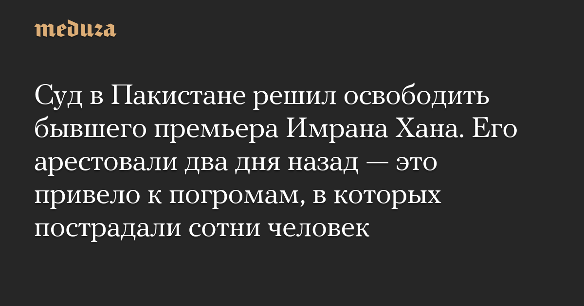 Суд в Пакистане решил освободить бывшего премьера Имрана Хана. Его арестовали два дня назад — это привело к погромам, в которых пострадали сотни человек