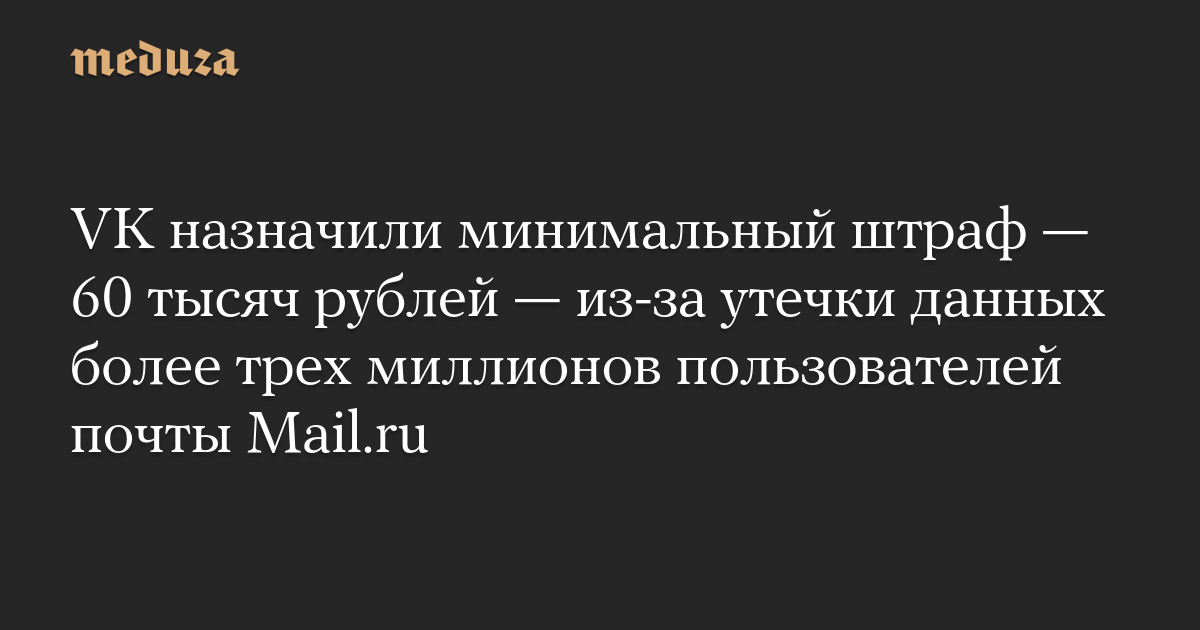 VK назначили минимальный штраф — 60 тысяч рублей — из-за утечки данных более трех миллионов пользователей почты Mail.ru