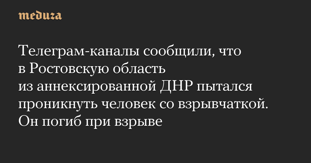 Телеграм-каналы сообщили, что в Ростовскую область из аннексированной ДНР пытался проникнуть человек со взрывчаткой. Он погиб при взрыве