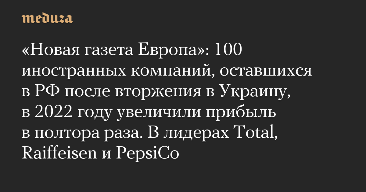 «Новая газета Европа»: 100 иностранных компаний, оставшихся в РФ после вторжения в Украину, в 2022 году увеличили прибыль в полтора раза. В лидерах Total, Raiffeisen и PepsiCo