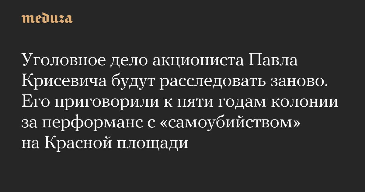 Мосгорсуд вернул на доследование в прокуратуру уголовное дело акциониста Павла Крисевича, осужденного на пять лет колонии за перформанс с «самоубийством» на Красной площади.