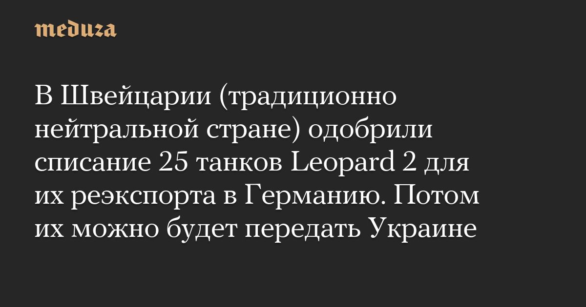 Национальный совет Швейцарии (одна из двух палат парламента) одобрил списание 25 танков Leopard 2, сообщают SRF и Basler Zeitung. Если Совет кантонов (вторая палата парламента) также одобрит это решение, то Швейцария сможет реэкспортировать танки в Германию, а немецкие власти смогут передать их Украине.