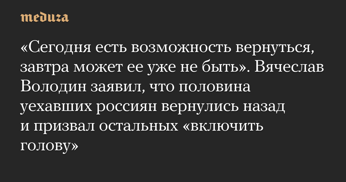 «Сегодня есть возможность вернуться, завтра может ее уже не быть». Вячеслав Володин заявил, что половина уехавших россиян вернулись назад и призвал остальных «включить голову»